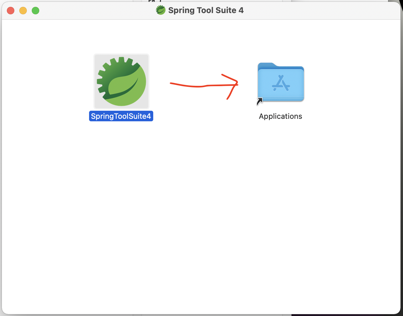 Finder에서 왼쪽 응용 프로그램 클릭하고, 오른쪽에서 SpringToolSuite4를 클릭하면 아래와 같은 화면이 나타남.