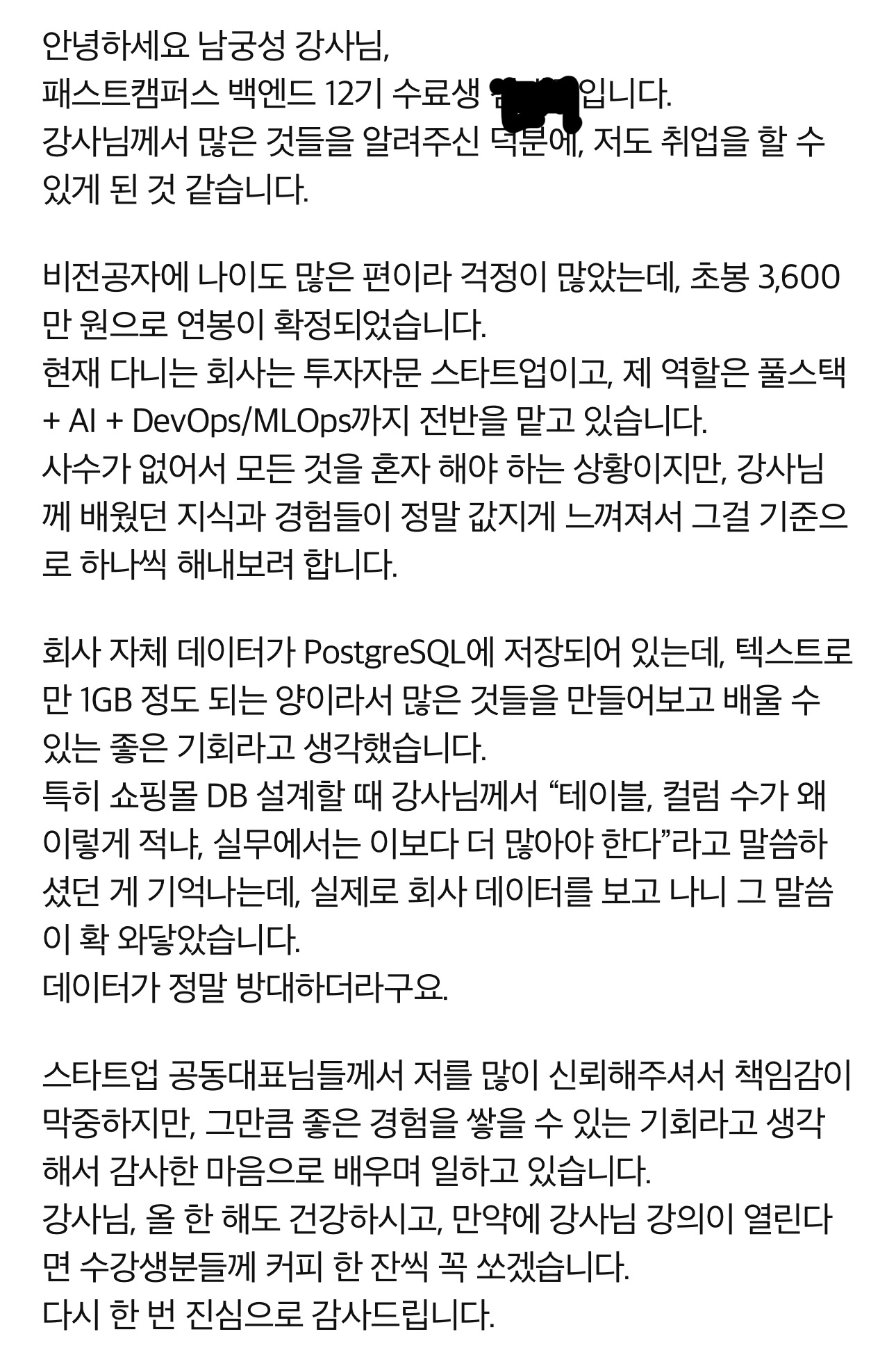 어제 정석코딩 졸업생에게서 취업 소식을 전해들었습니다.
